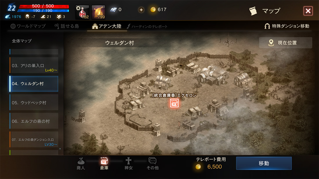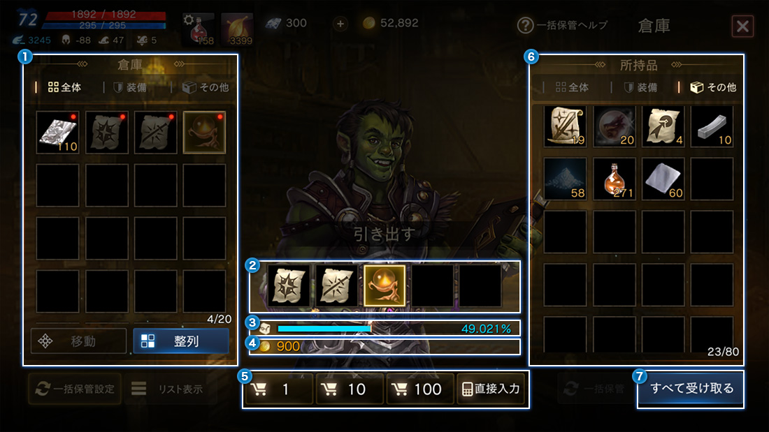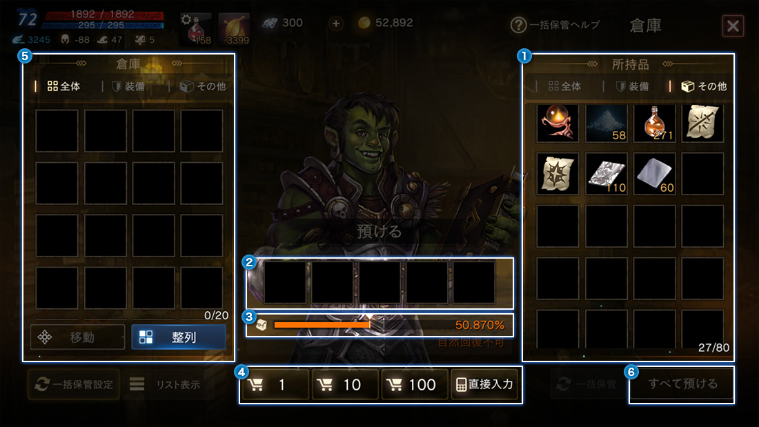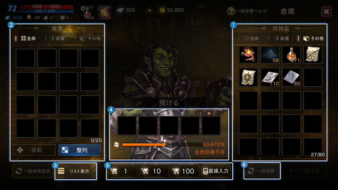 倉庫は手持ちのアイテムを預けることができるスペースで、倉庫のアイテムはアカウント内の同一サーバーキャラクターすべてで共有することができます。<リネージュM>はキャラクターのSTRとCON、アイテムについている重量軽減オプションに応じてバッグに入れることができる持ち物の限界値(最大重量)が決定されます。重量ゲージが50%以上になると戦闘に関するペナルティを受けるため、不必要なアイテムは店に売ったり倉庫に保管して重量を管理する必要があります。