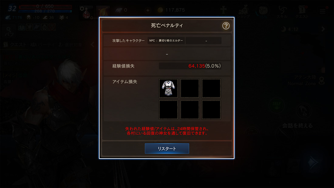 キャラクター死亡と同時に[死亡ペナルティ]ウィンドウから損失した経験値を確認でき、損失する経験値はキャラクターのレベルによって増加します。