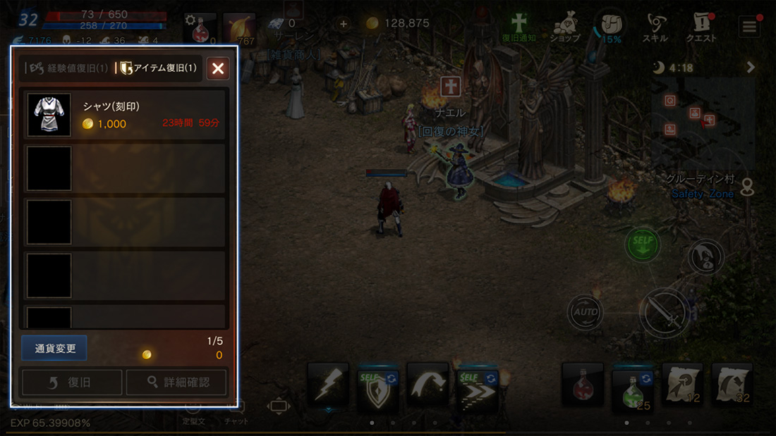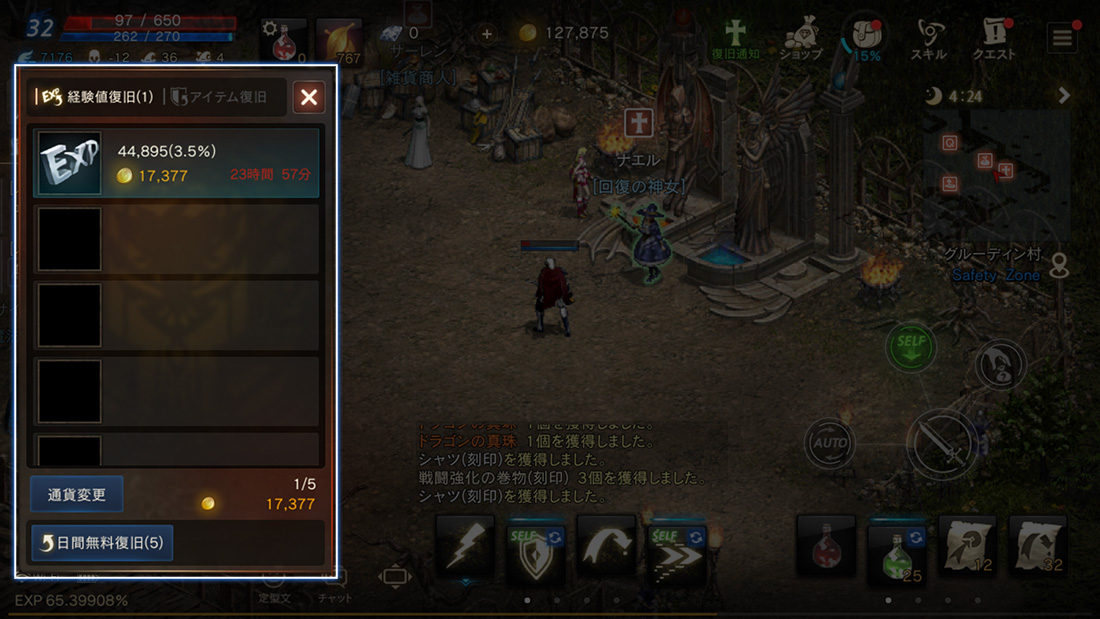 キャラクターがモンスターや他のプレイヤーによって死亡した場合、経験値やアイテムを損失することがあります。この時、失われた経験値とアイテムはダイヤもしくはアデナを支払い、[回復の神女]から復旧することができます。経験値については45レベル以下は毎日最大5回、46~69レベルは毎日最大3回、70レベル以上は毎日最大2回まで無料で復旧することができ、キャラクターのレベルが増加するほど復旧費用が高くなるので、キャラクターの死亡に注意しましょう。