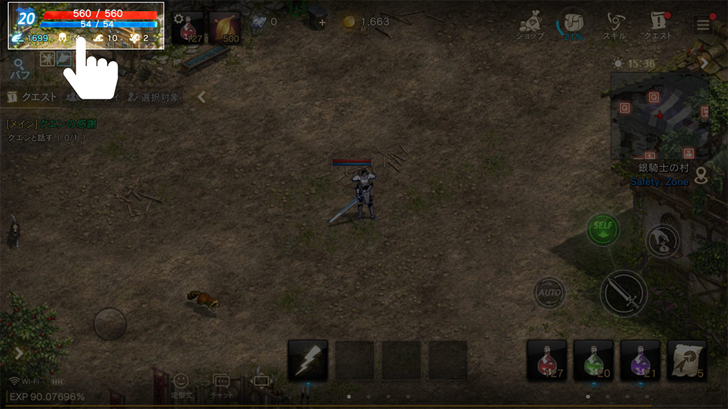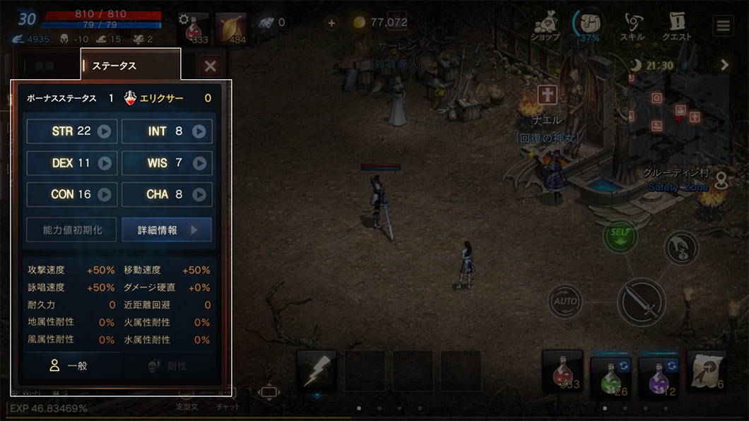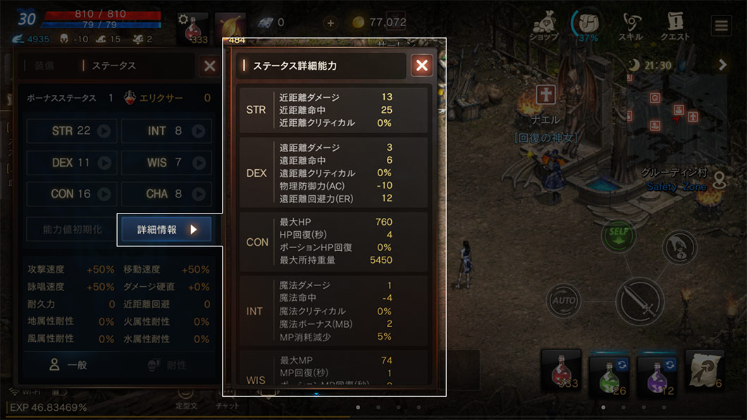 ステータスウィンドウでキャラクターのステータスや装備のステータスによる能力値上昇効果を確認できます。