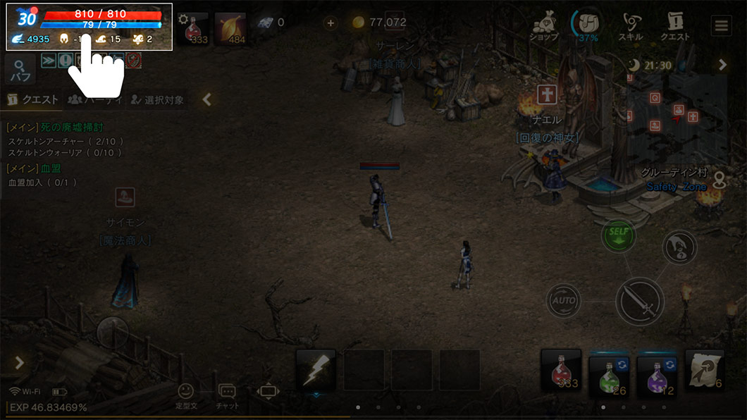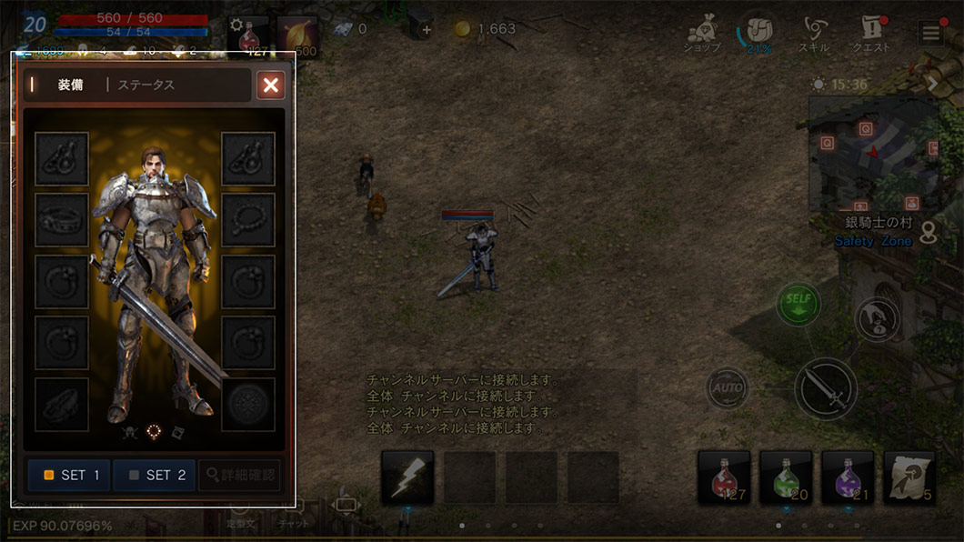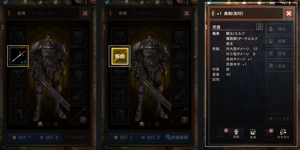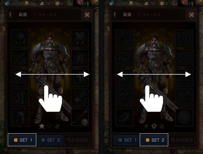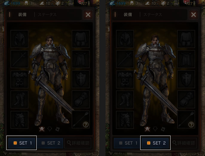 装備の1SET、2SETボタンを押して、設定した装備をまとめて変更できます。