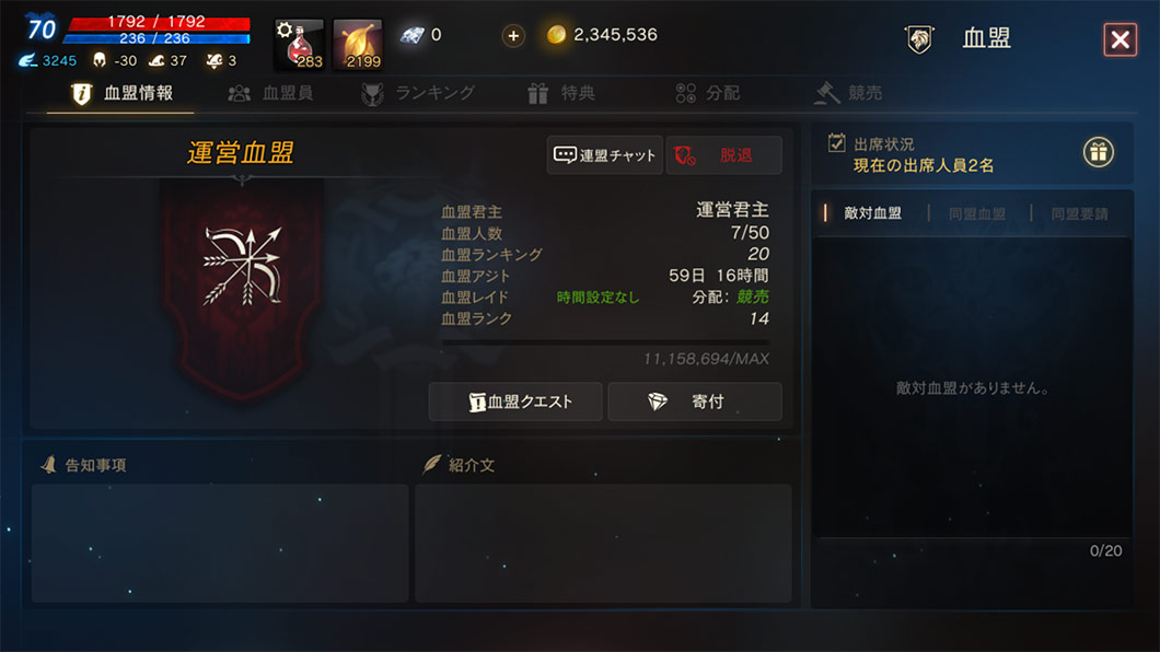 加入している血盟情報、血盟員、血盟ランキングを確認でき、血盟の脱退も行えます。