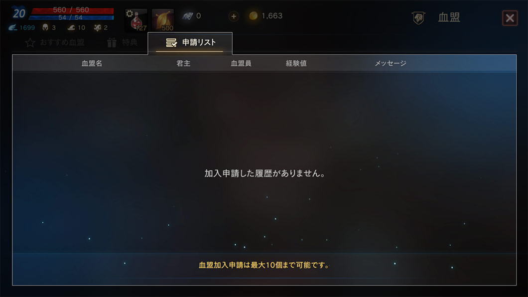 血盟加入申請は、最大10個まで可能です。