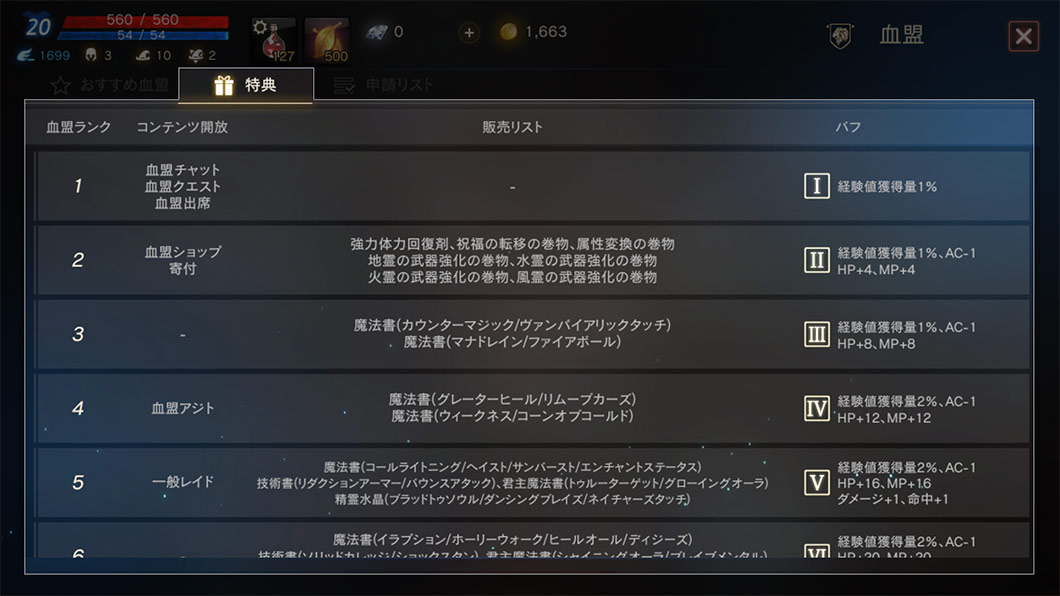 血盟ランクに基づいて血盟専用コンテンツ/バフ特典を確認できます。