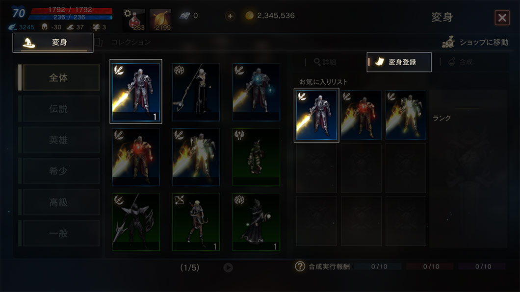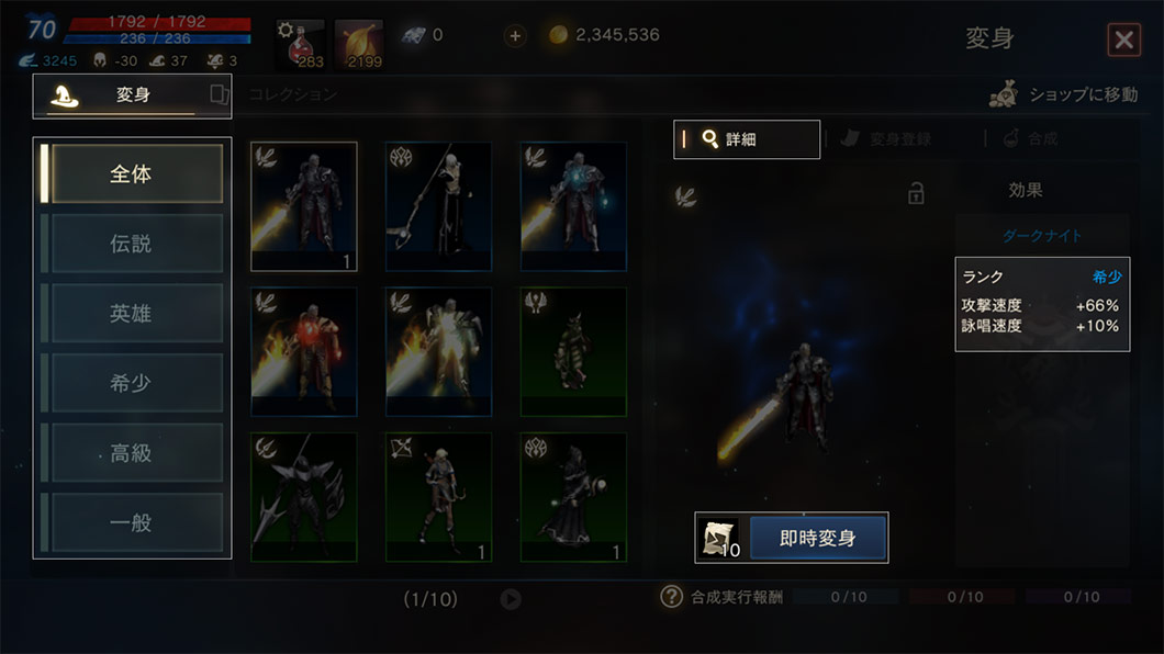 変身の等級(伝説/英雄/希少/高級/一般)と変身のオプションを確認できます。変身の巻物がある場合は、すぐに変身もできます。