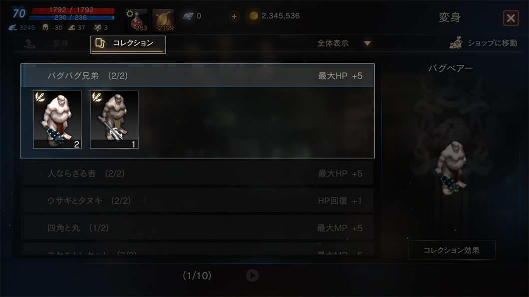 コレクションに合致する変身を所持すると、追加のオプションが発生します。