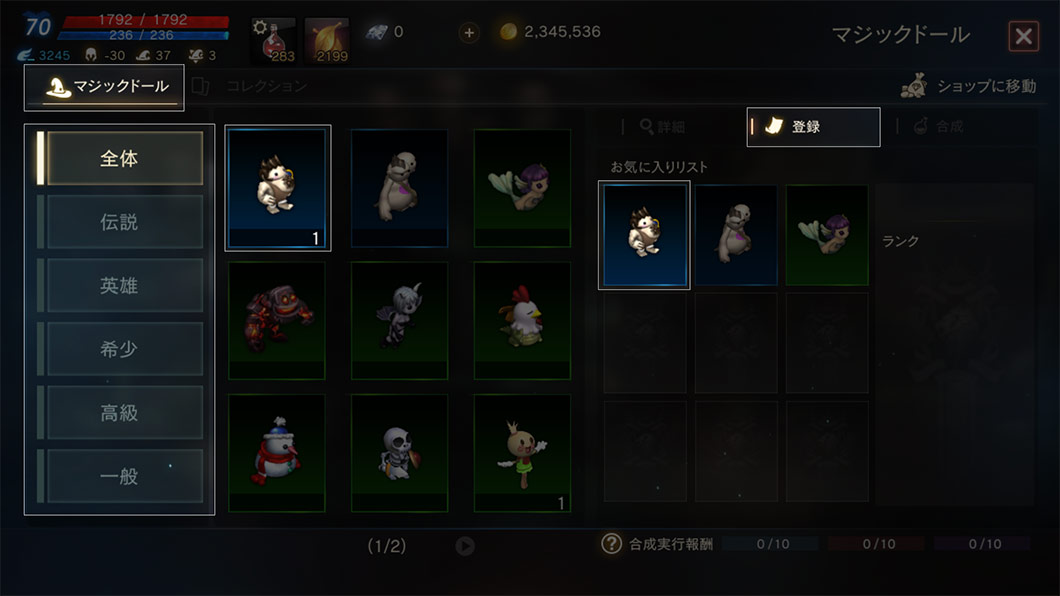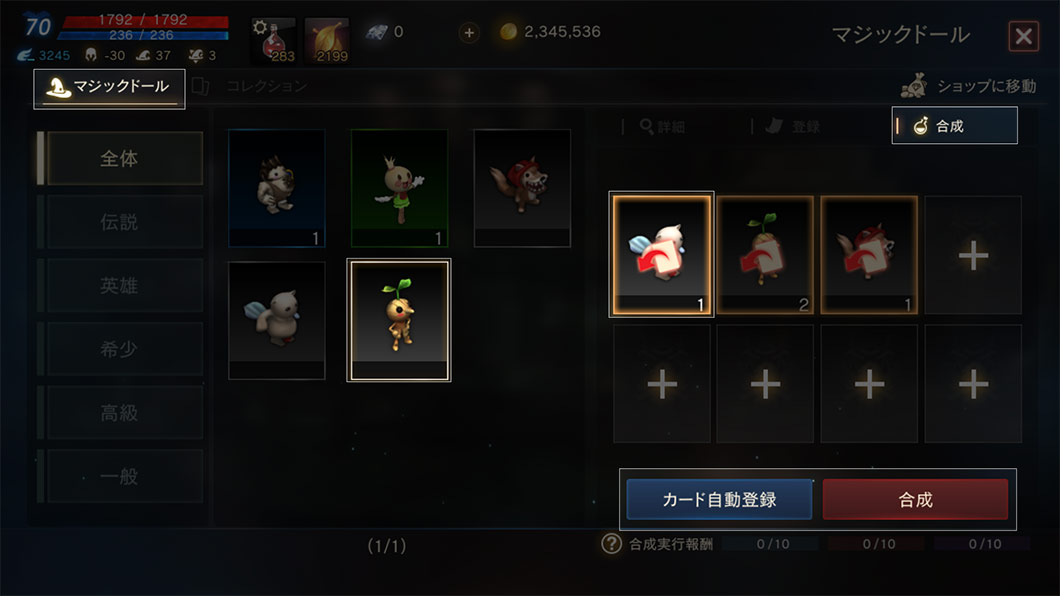 所持しているマジックドールカードを合成して、上位等級へのアップグレードに挑戦できます。