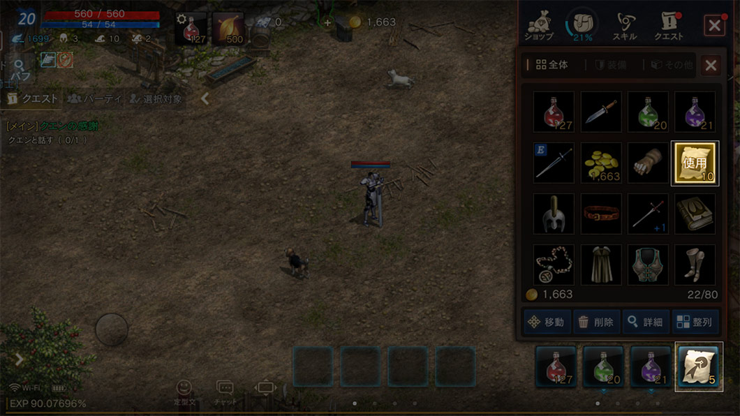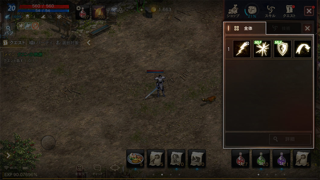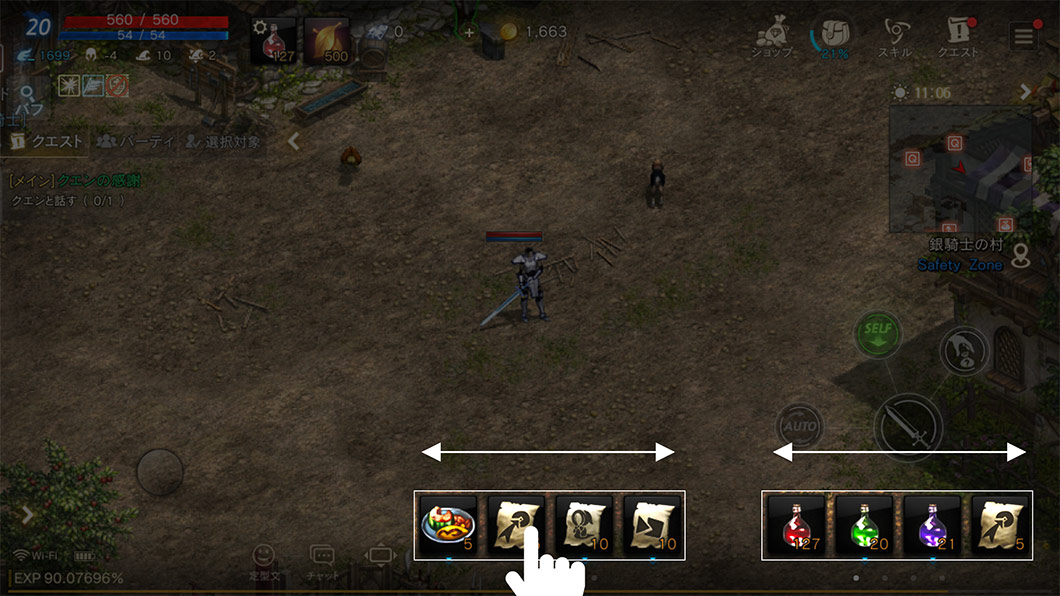 アイテムとスキル(魔法)をクイックスロットに登録/解除することができ、登録されたクイックスロットを下にスライドすると、クールタイムに応じて自動的に使用されます。