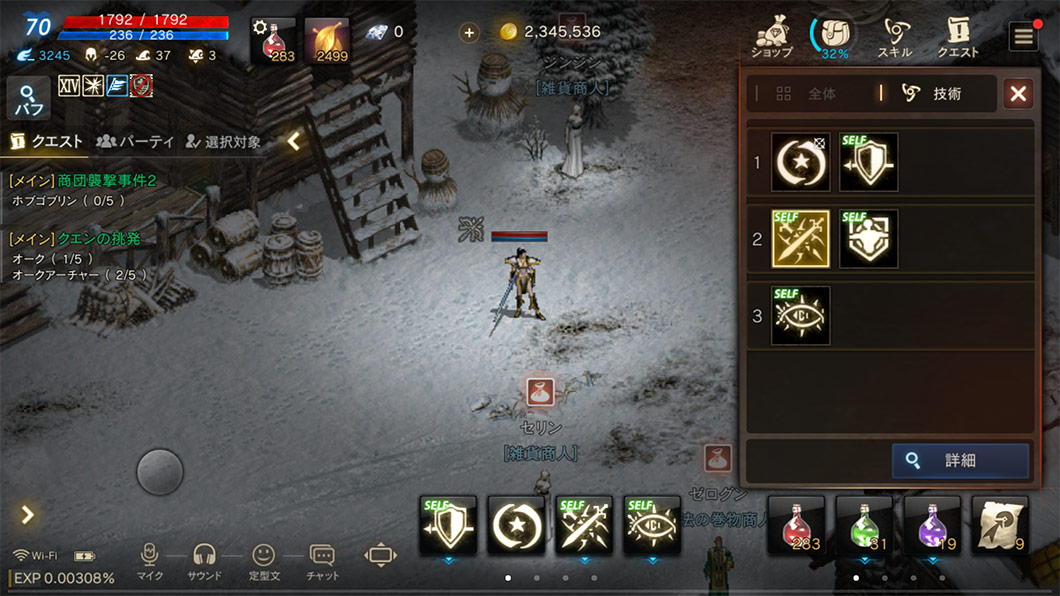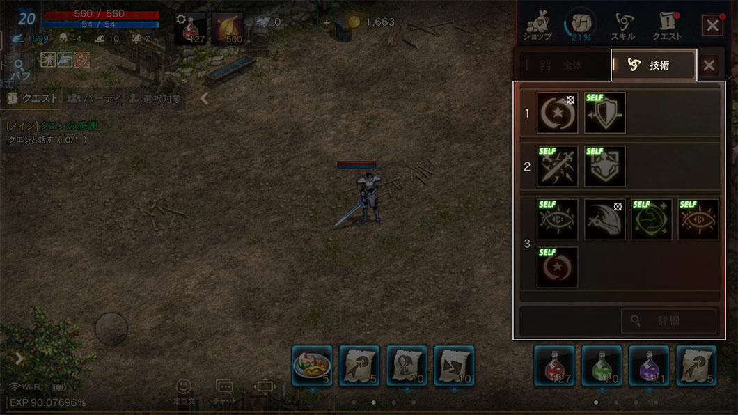 技術のウィンドウで、魔法や技術を選択すると、すぐにクイックスロットに登録してすぐに使用するように設定できます。