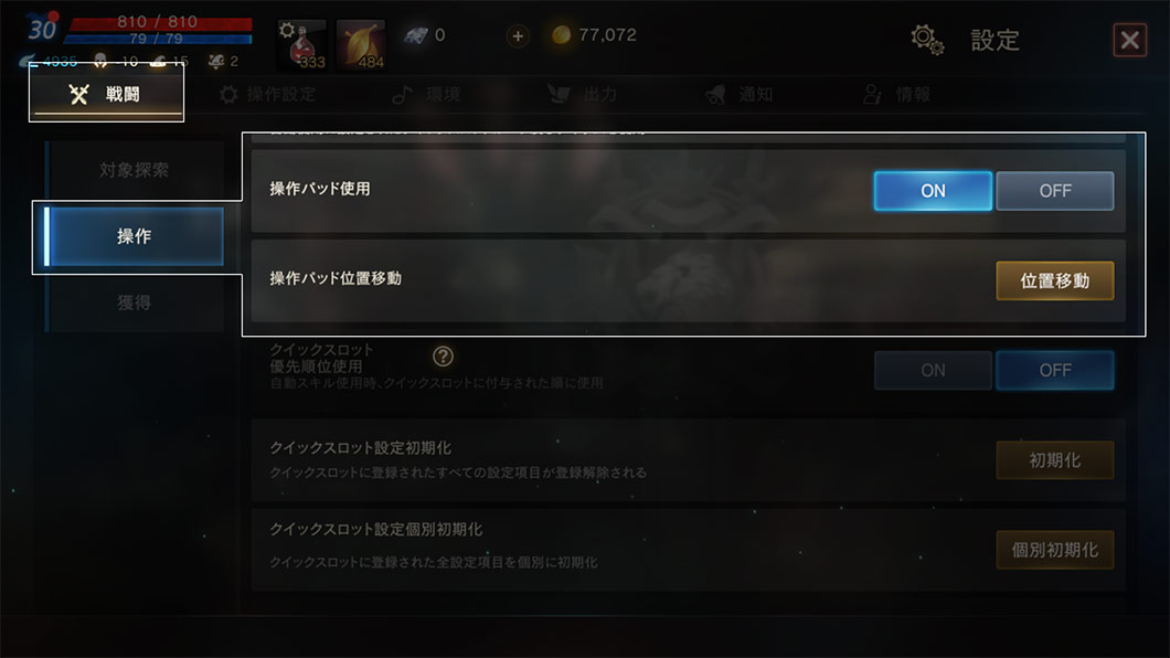メニュー>設定>戦闘>操作から操作パッドの使用設定や、パッドの位置を変更できます。