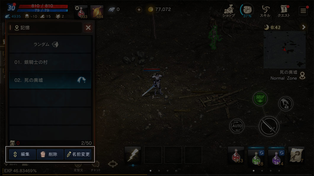 記憶場所のリストから記憶した位置を編集、削除したり、名前を変更できます。