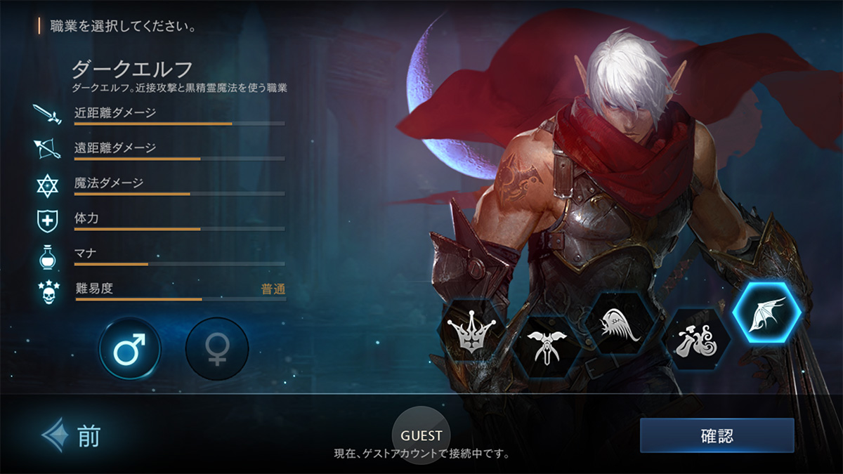 ダークエルフは強い物理攻撃力を持つ典型的な攻撃型職業です。専用武器のデュアルブレードとクロウを使用し戦闘で相手に強力なダメージを与えることができます。また、独自の魔法である黒精霊魔法による自己強化(バフ)でさらに高い火力を出すことができます。