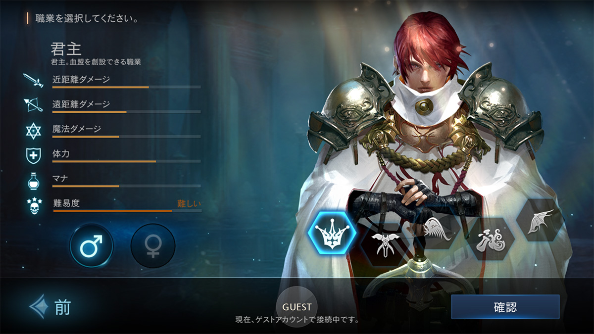 君主は<リネージュM>のギルドシステムである血盟を作ることができる唯一の職業です。自分が作った血盟を通じて攻城戦参加、アジトレンタルなど多様なシステムを利用することができ、カリスマ(CHA)ステータス数値に基づいて血盟を募集することができる人数が増減します。対モンスターや対人戦能力はそれほど高くありません。