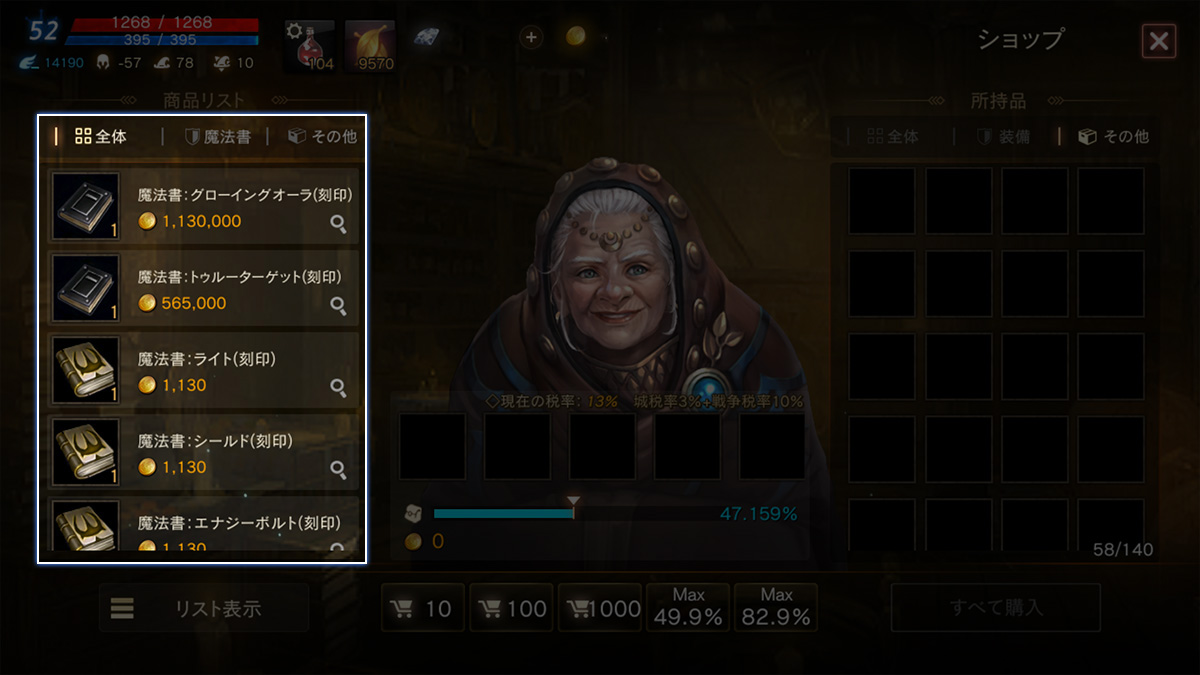 君主は2段階の一般魔法とオーラ(スキル)を習得できます。魔法やスキルは特定の村に存在する魔法商人サイモンからスキルブックを購入して学ぶことができます。いくつかのスキルブックは、特定の村の魔法商人から購入することができます。
