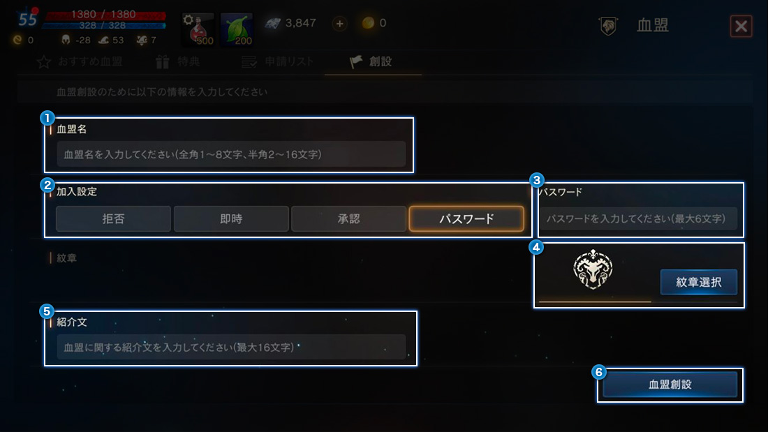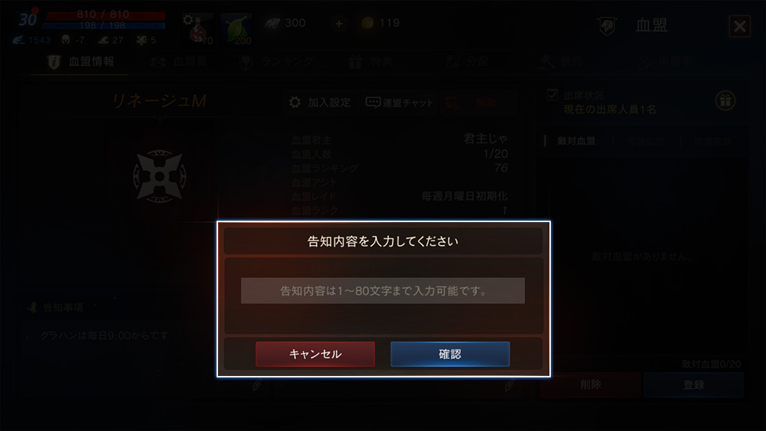 血盟は30レベル以上の君主のみ創設することができます。現在血盟に所属しているか、24時間以内に血盟脱退もしくは解散した場合には、血盟を創設することができません。