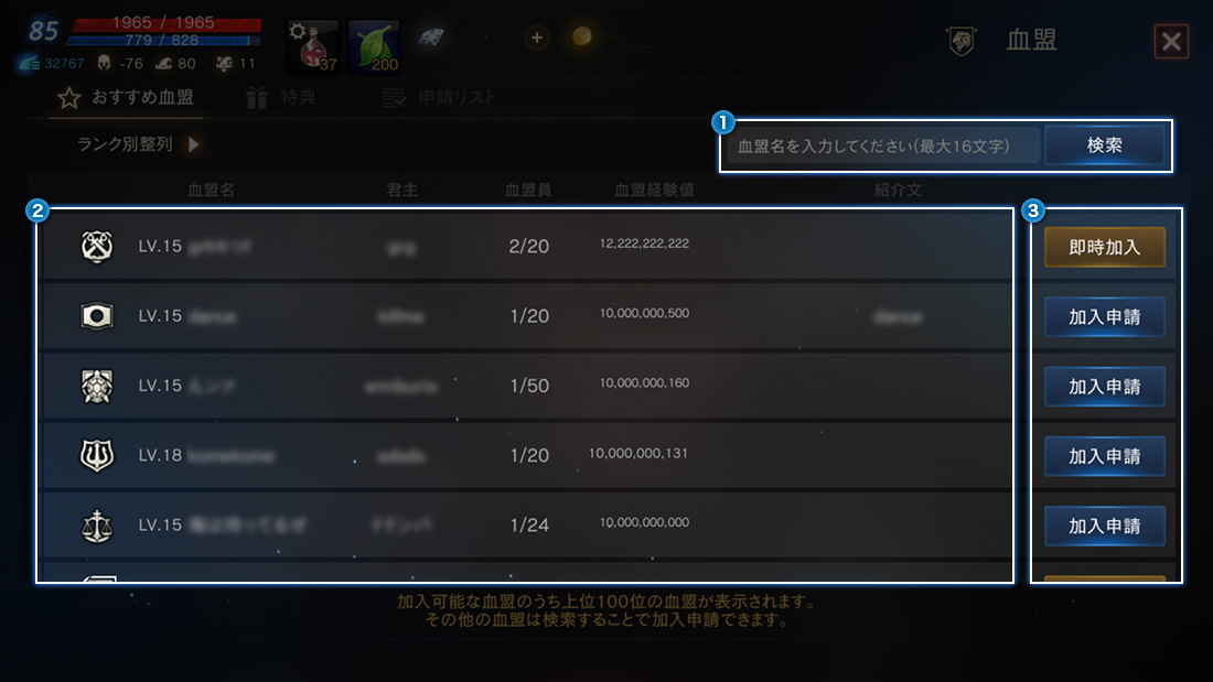 血盟はキャラクターにつき1つの血盟に所属することができますが、血盟を創設している君主は、他の血盟に加入することはできません。血盟加入はレベル30以上のキャラクターのみ可能です。過去24時間以内に血盟を脱退している場合には、加入申請ができません。