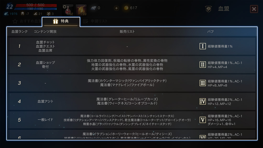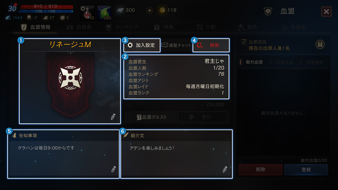 血盟の詳細情報を確認できます。血盟君主だけが利用できるメニューもあり、血盟員間の様々な特典を受けることができます。