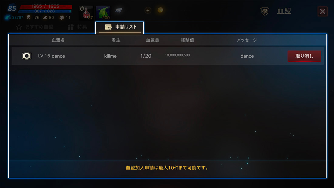 加入申請した血盟のリストと申請の取り消しを行うことができます。申請の取り消しをタップすると、加入申請が取り消されます。