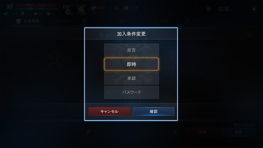 | 申し込みキャンセル | プレイヤーがその血盟に加入申請をした状態 |