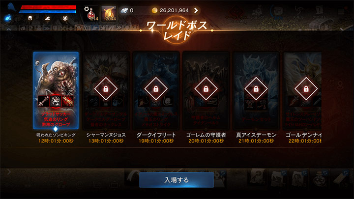 2. 入場可能なワールドボスレイドを選択し、<入場する>ボタンをタップします。