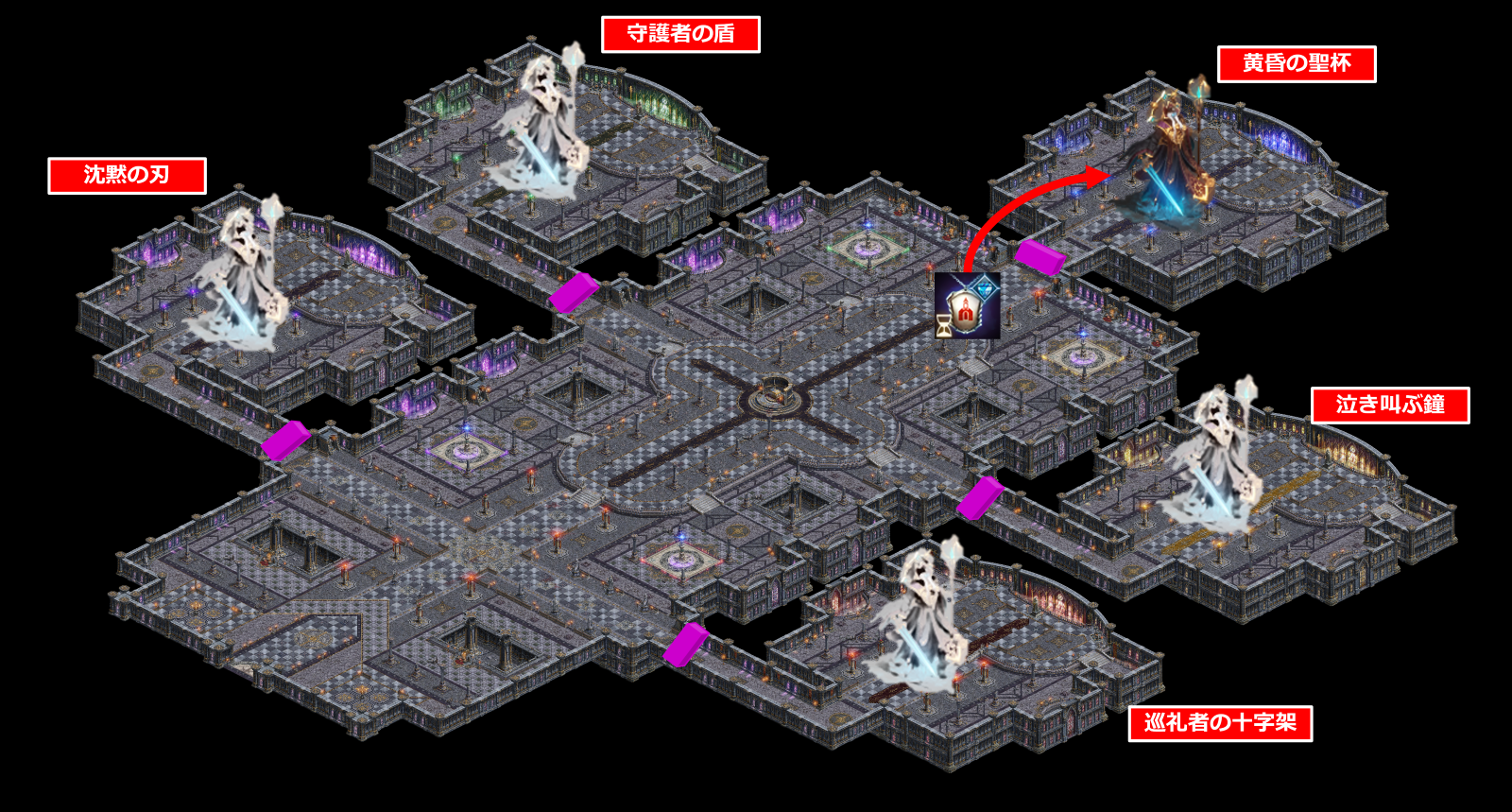 「タイムアタックイベント」は最初の段階として、「ナグバスの礼拝堂」にある5つの「守護者の領域」へ出現するボスを討伐し該当の領域の石像を活性化させる事が目的です。