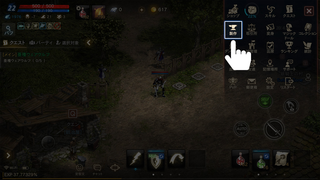 メニューから製作をタップすると、製作画面で製作アイテムの能力値と材料を確認することができます。