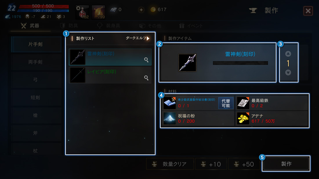 アイテム製作は武器、防具、装身具、その他、イベントで5つに区分されます。