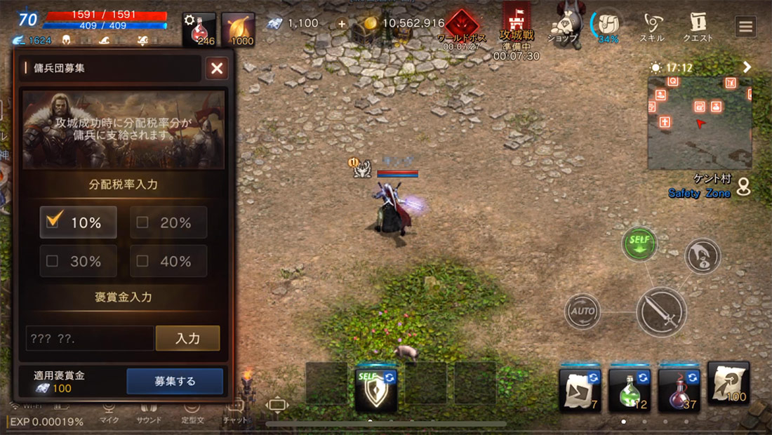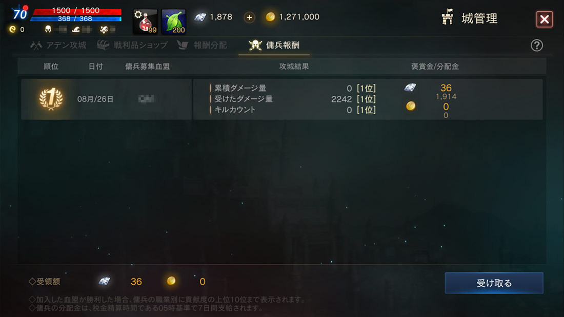褒賞金は、最初に傭兵を募集した血盟の君主が設定した内容を貢献度に応じて順番にもらえます。