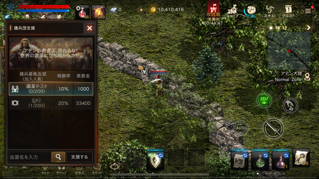自分が所属している血盟が攻城戦の布告をしていなくても、個別に布告血盟の傭兵として攻城戦に参加することができます。