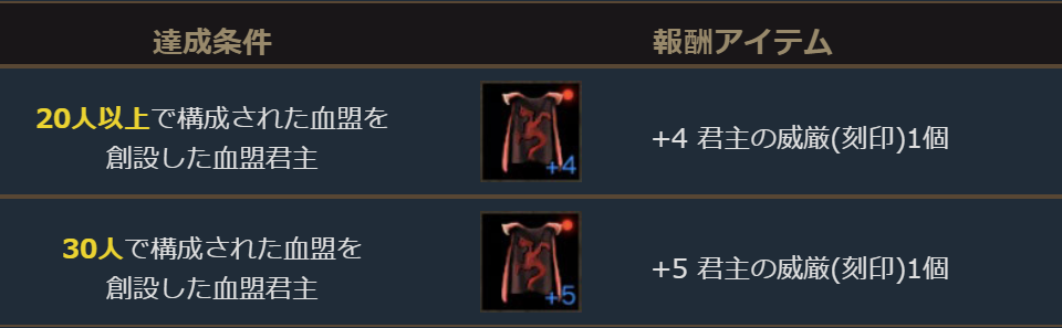 30人で構成されている血盟の血盟君主のお客様は、「+5君主の威厳(刻印)」のみ受け取ることができ、「+4君主の威厳(刻印)」は受け取ることができません。