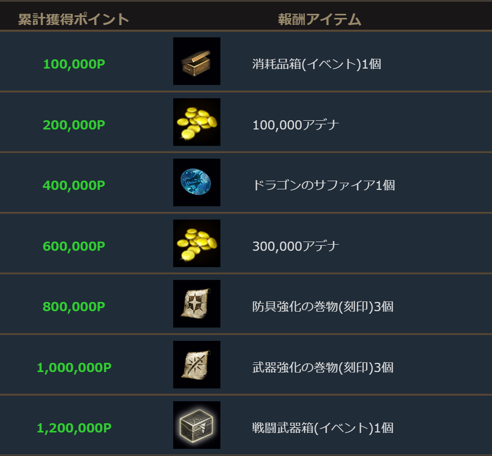 報酬は、到達した累計獲得ポイントまでのすべてのアイテムを受け取ることができます。