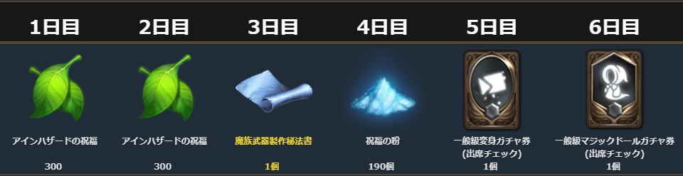 3日間ゲームに接続すると、希少級武器の"魔族武器"の製作材料「魔族武器製作秘法書」を獲得することができます。