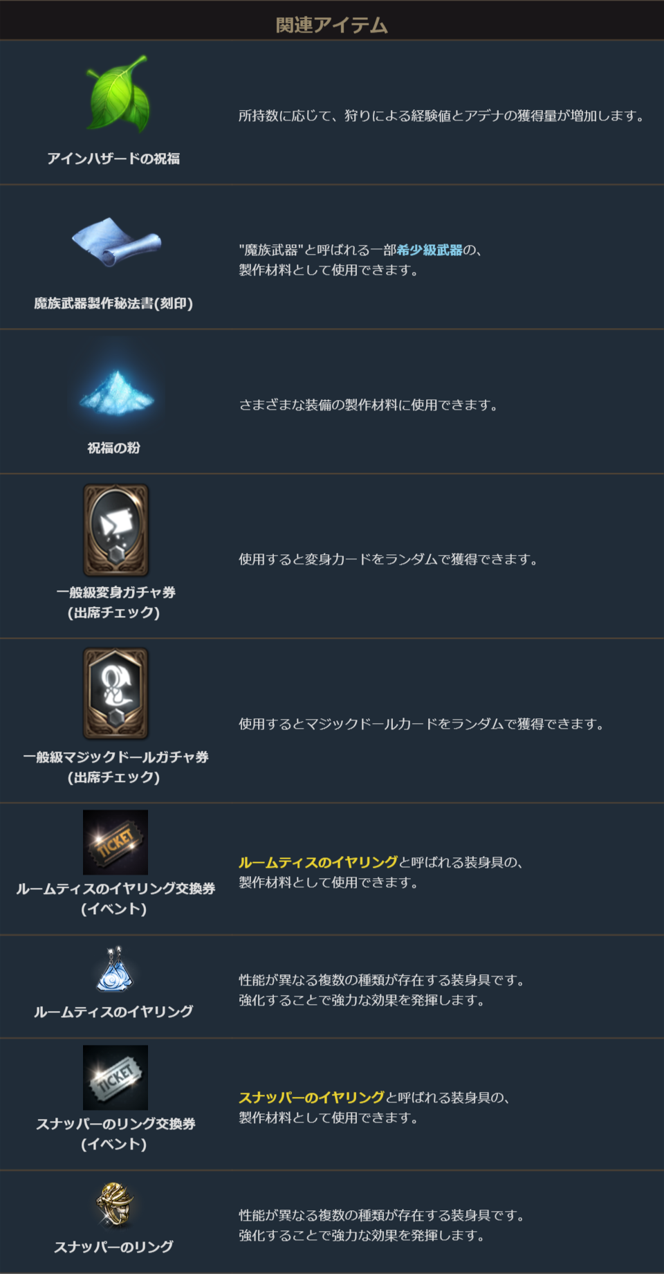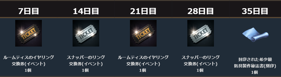 さらに、7日ごとに貴重な装備の"ルームティスのイヤリング"や"スナッパーのリング"の製作材料なども獲得できます。