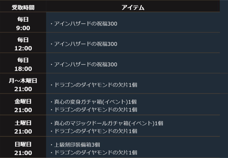 ピクシーから毎日9時/12時/18時/21時にゲーム内の「郵便箱」に、冒険に役立つアイテムが贈られます。