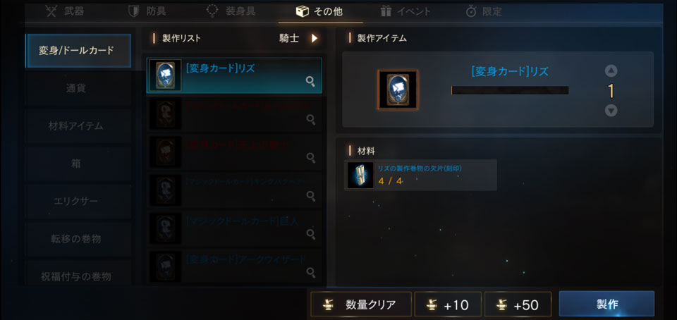 各パッケージを購入すると1つずつ獲得できる「リズの製作巻物の欠片(刻印)」を4つ集めると必ず製作することができます。