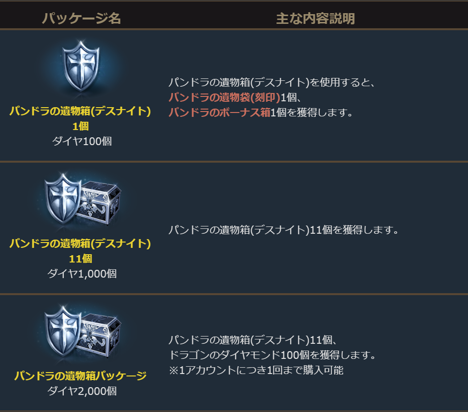 ※「パンドラの遺物箱(デスナイト)1個」、「パンドラの遺物箱(デスナイト)11個」、「パンドラの遺物箱パッケージ」は2019年6月26日(水)メンテナンス開始時まで購入できます。