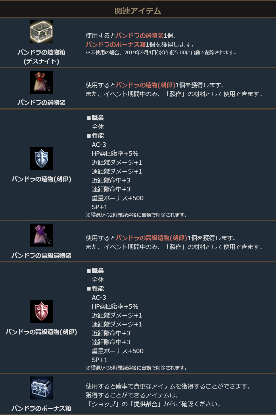 ※「パンドラの遺物箱(デスナイト)」が未使用の場合、2019年9月4日(水)午前5:00に自動で削除されます。