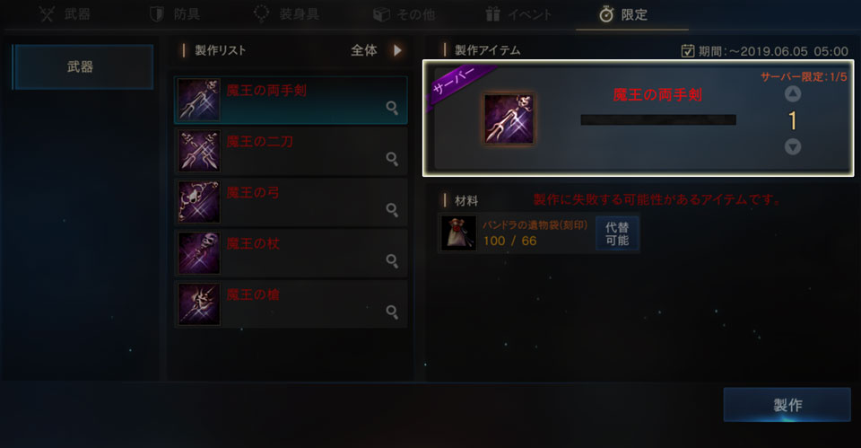 ※サーバー数量限定の製作アイテムは、製作に失敗する場合があります。