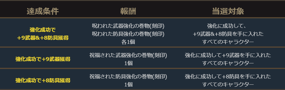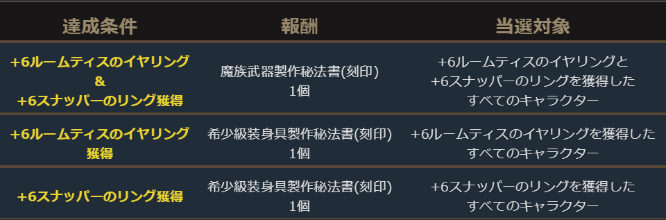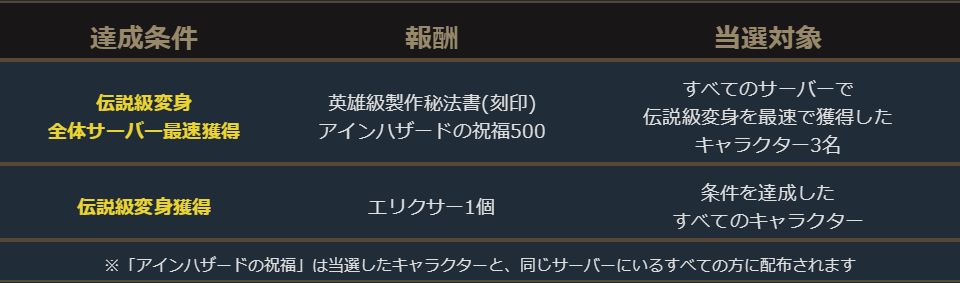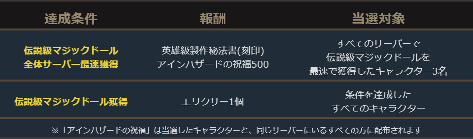※「全体サーバー最速到達」と「サーバー別最速到達」、「全体サーバー1位」と「サーバー別1位」はそれぞれ重複当選せず、「全体サーバー」の当選が優先されます。