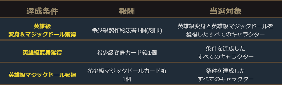 試練を達成すると、変身製作コインとマジックドールコインが各50個手に入る狩人の箱(イベント)を獲得できます。