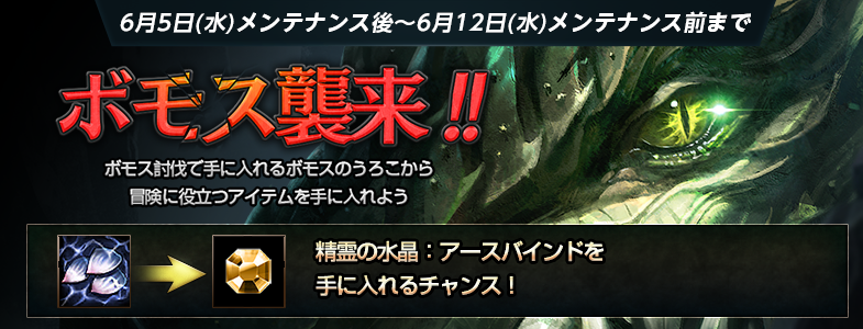 ボスモンスターが期間限定で出現するイベント「ボモス襲来!!」についてお知らせいたします。