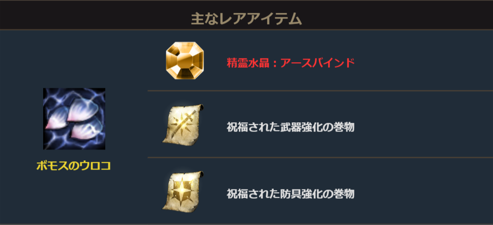 「ボモスのウロコ(イベント)」を使用して、精霊魔法「アースバインド」を覚えることができる精霊水晶など、冒険に役立つアイテムを手に入れましょう!