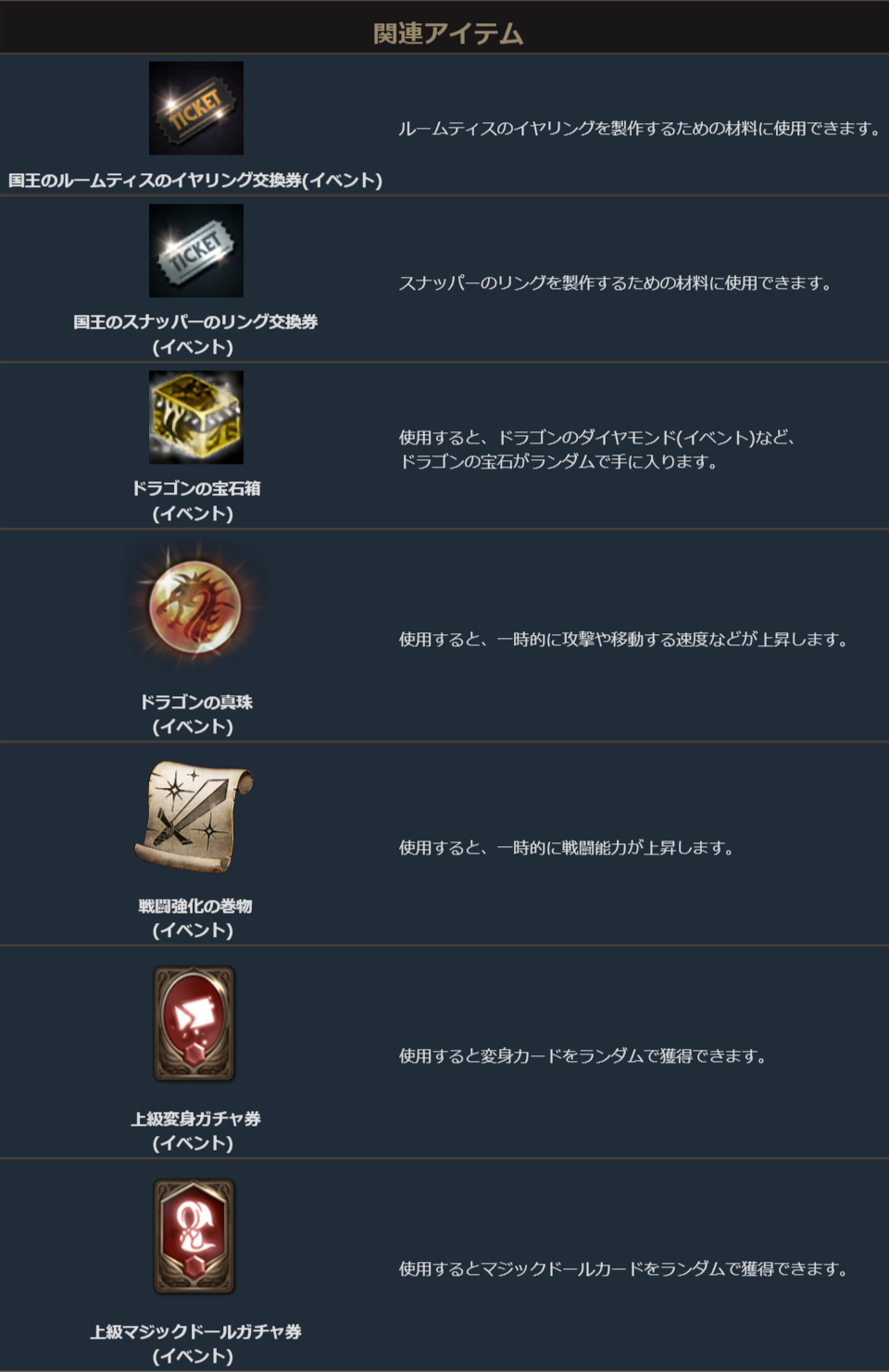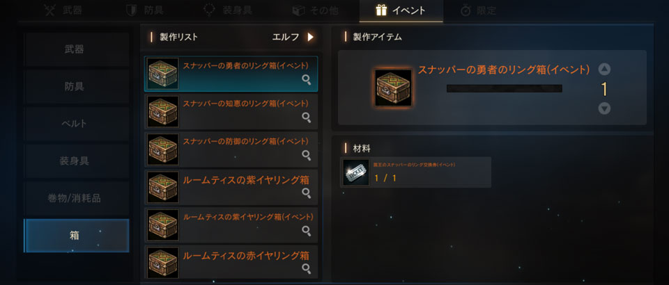 「ロイヤルハンティング」の各所で獲得できる国王のルームティスのイヤリング交換券(イベント)や国王のスナッパーのリング交換券(イベント)は、「製作」の「イベント」タブでルームティスのイヤリング箱とスナッパーのリング箱を製作することができます。