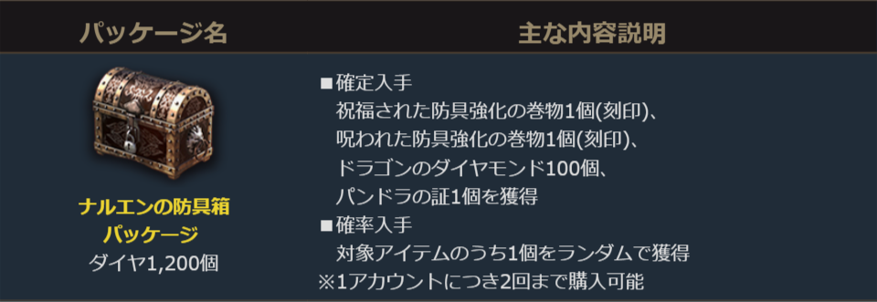 防具や防具強化の巻物、ドラゴンのダイヤモンドなどが手に入る「ナルエンの防具箱パッケージ」についてお知らせいたします。