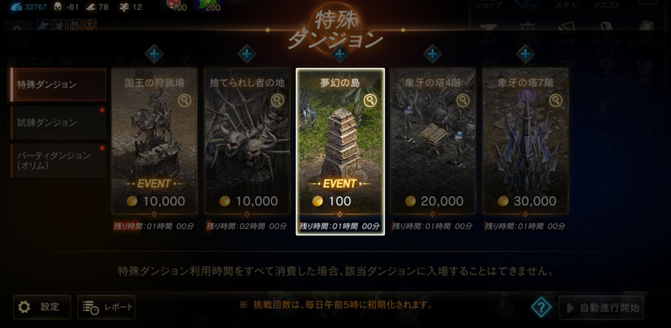 ※特殊ダンジョンの入場制限は毎日午前5:00に初期化されます。