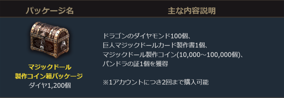 ドラゴンのダイヤモンドや、巨人マジックドールカード製作書などが手に入る「マジックドール製作コイン箱パッケージ」についてお知らせいたします。
