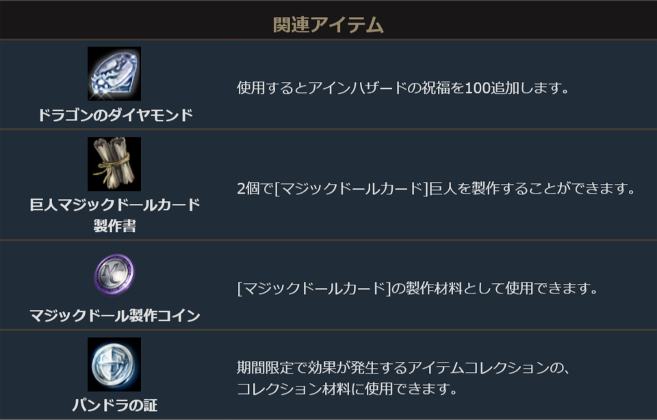 「マジックドール製作コイン箱パッケージ」で獲得できる「パンドラの証」を材料に、期間限定で効果が発動するアイテムコレクションが登場!