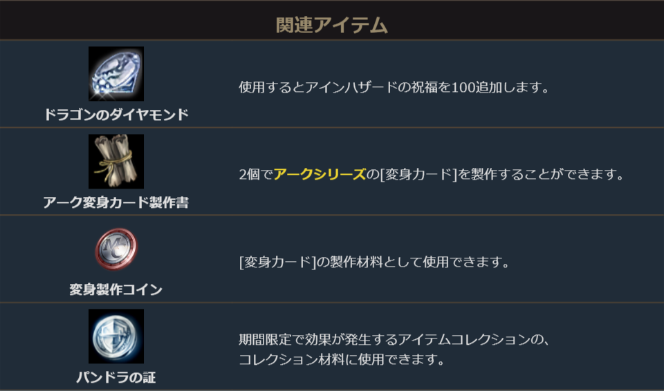 ※「パンドラの証」を材料に使用するコレクションは、2019年9月4日(水)メンテナンス以降は効果がなくなります。