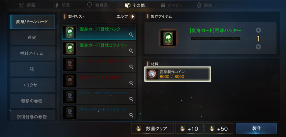 製作でしか手に入らない変身カードや、全職業で使用できる英雄級変身カード「天上の騎士」を製作することが可能です。