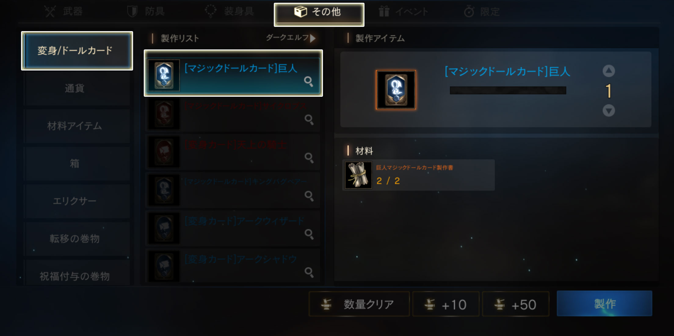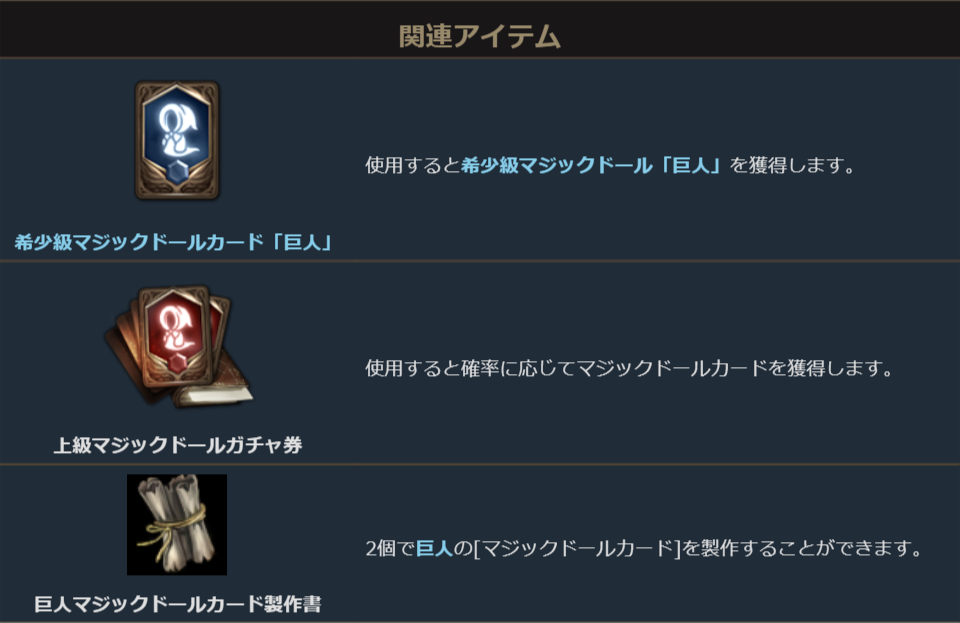 「巨人マジックドールカード製作書」を2個集めると、希少級マジックドール「巨人」を必ず製作できます。